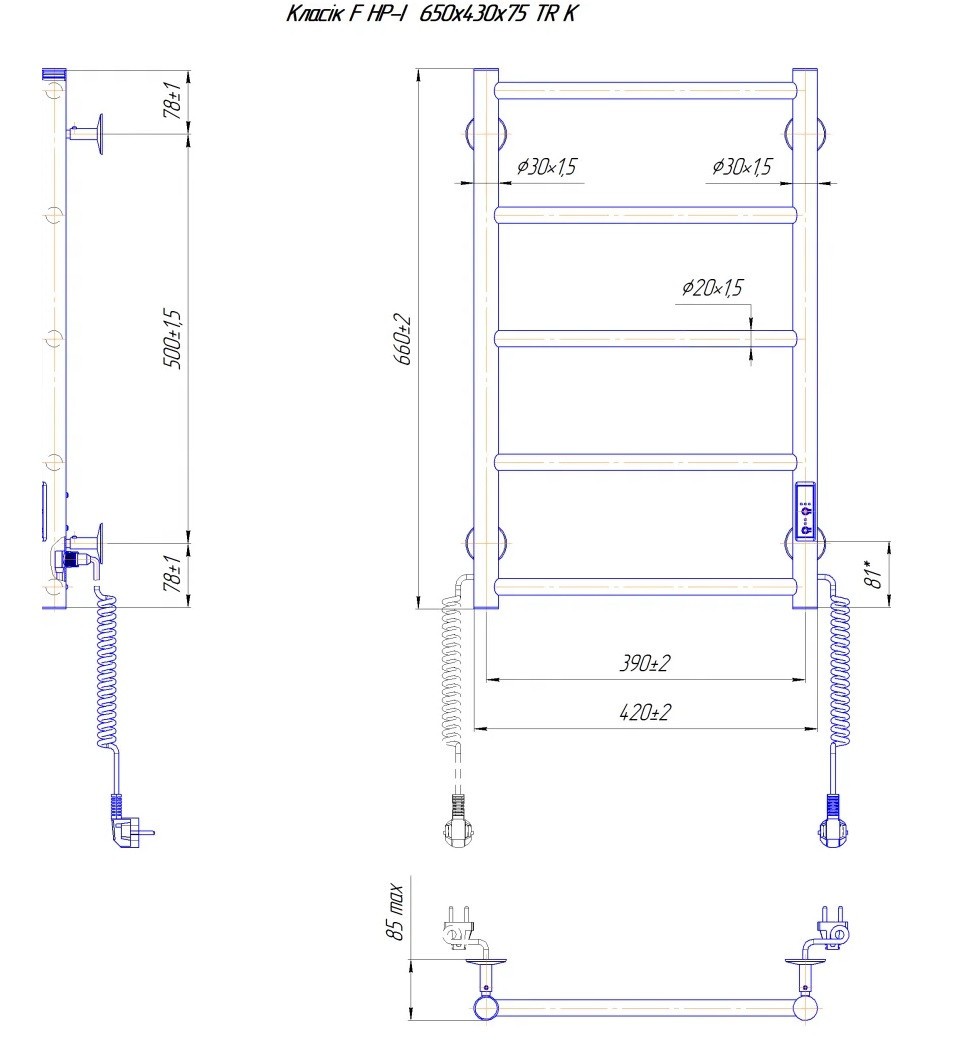 Подключение полотенцесушителя Классик F НР-I 650 х 730 TR К к электросети может быть – левое или правое. Полотенцесушитель оборудован коннектором для подключения к розетке с нужной стороны: слева или справа.