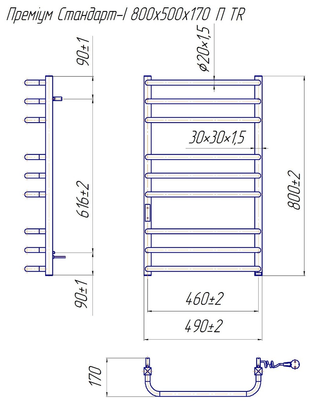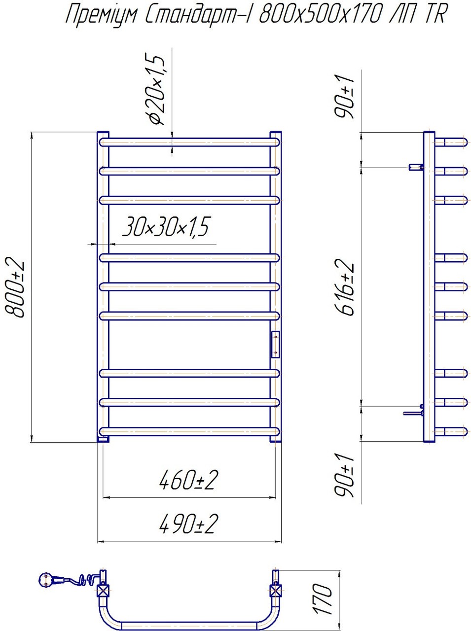 Рушникосушарка Преміум Стандарт- I — електрична рушникосушарка з таймер-регулятором, перемички розташовані в різних площинах зі стоєвими трубами, бічні труби виготовлені з профільної (квадратної) труби.
