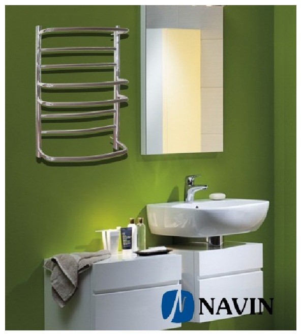 Електрична сушарка для рушників Омега (Navin) - електрична сушарка для рушників із неіржавкої сталі. Форма моделі Симфонія (Navin) водяна доповнена електричним ТЕНом з можливістю регулювання температури сушарки для рушників.