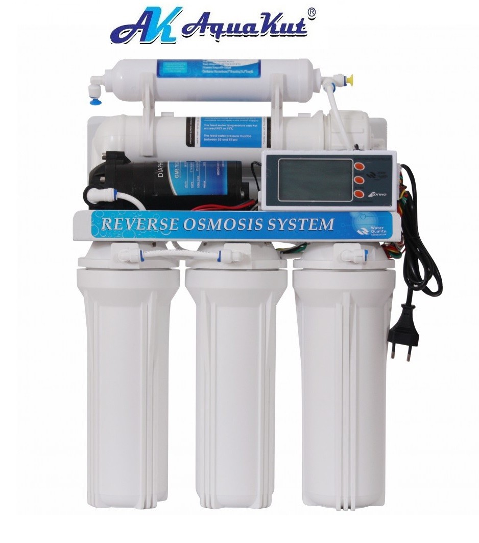 Осмос AquaKut з помпою 50G RO-6 С-01 з електронним контролером (продуктивність 190 літрів на добу). Сфери застосування: житлові приміщення, харчова промисловість, фармацевтика, медицина, плавальні басейни. З'єднання Quick, із соленоїдом замість чотирьох ходового клапана й електромагнітним клапаном з автоматичним промиванням мембрани.
