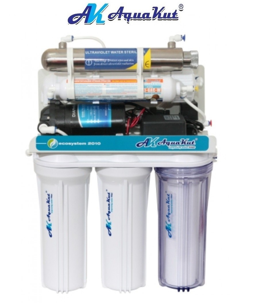 Осмос AquaKut з помпою й ультрафіолетовою лампою, 75G RO-6 А03 (продуктивність 285 літрів на добу). Сфери застосування: житлові приміщення, харчова промисловість, фармацевтика, медицина, плавальні басейни. З'єднання Quick, із соленоїдом замість чотирьох ходового клапана й електромагнітним клапаном з автоматичним промиванням мембрани.
