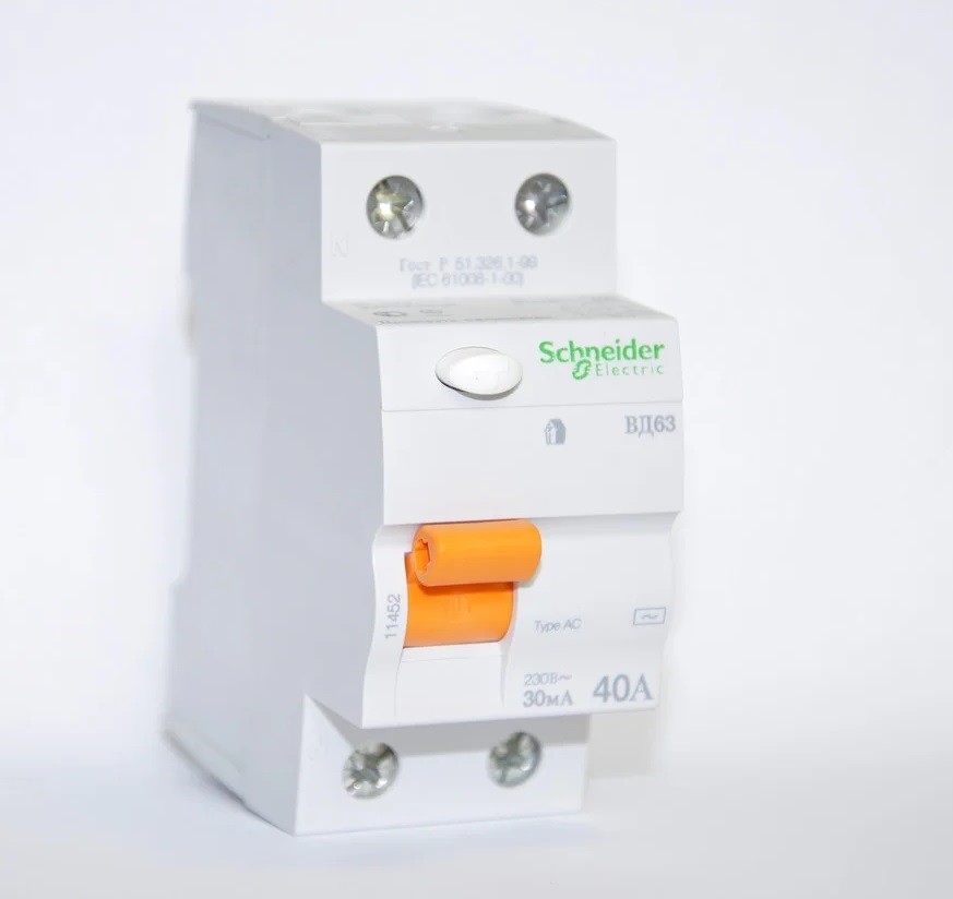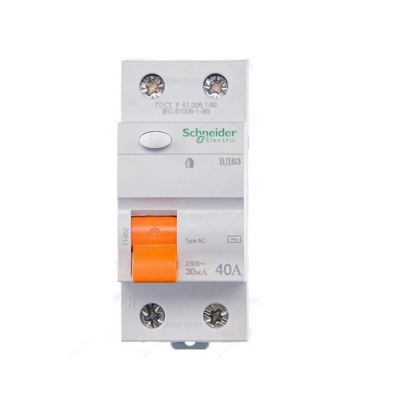 Диференціальний вимикач Schneider Electric ВД63 11452 серія "Додовий" 1P+N; номінальний струм — 40 А; струм витоку — 30 мА, тип АС.