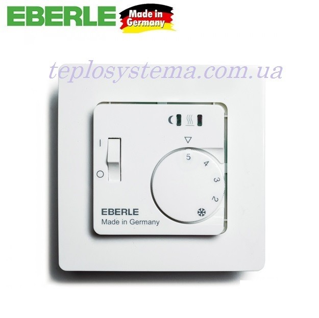 Електронний терморегулятор для теплої підлоги Eberle FRe F2A-50 (Німеччина) — найкраща модель механічного терморегулятора для теплої підлоги з датчиком температури підлоги. Вмикання й вимикання здійснюється за допомогою тумблера — це дає змогу зафіксувати температуру підлоги в потрібному вам діапазоні. Для зміни температури використовується регулювальне коліщатко, червоний індикатор світлодіода показує, що нагрівання увімкнене. Найнадійніша модель механічного терморегулятора з усіх наявних моделей на нашому ринку.