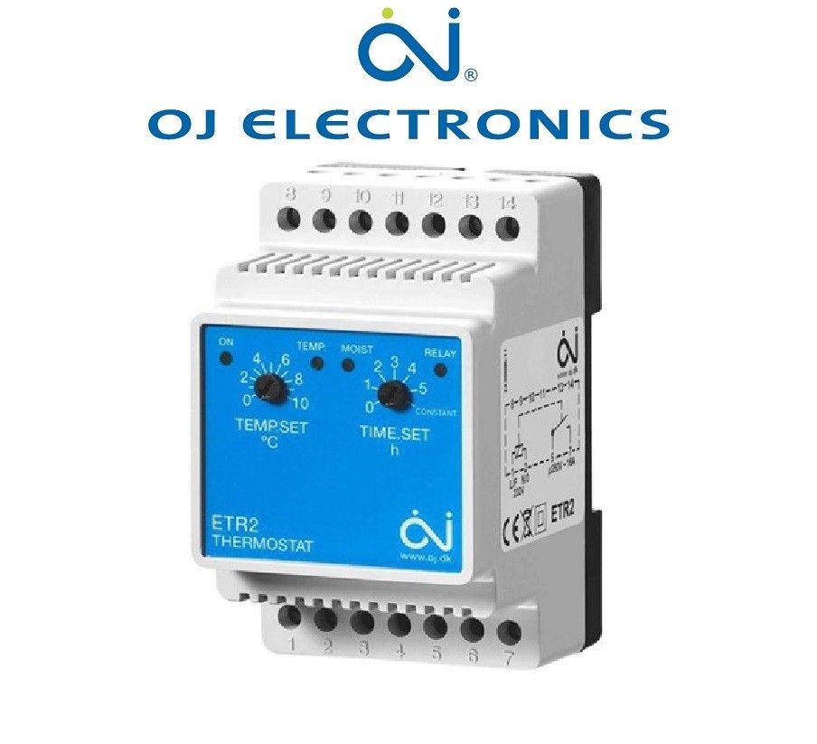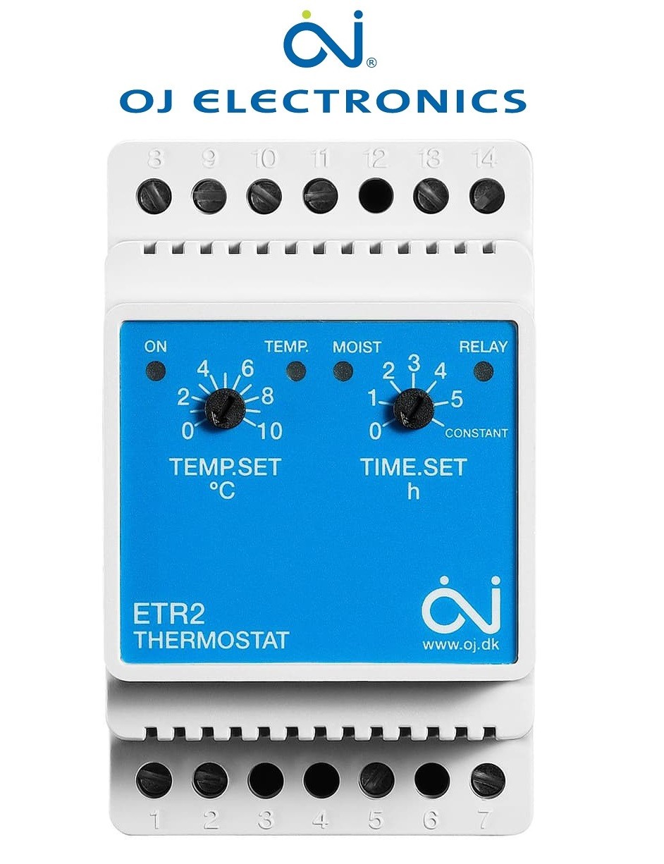 Терморегулятор ETR 2 — 1550 Oj Electronics (Данія) — електронний терморегулятор, для керування невеликою системою антиобмереження покрівлі. Терморегулятор містить нагрівання, використовуючи сигнал від датчика контролю температури повітря (датчик ETF-744/99 - не входить до комплекту термостата) і датчика контролю вологості (ETOR-55 — не входить до комплекту з термостатом).