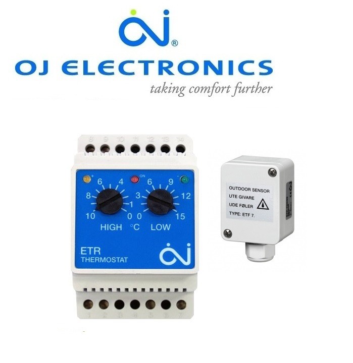 Терморегулятор ETR/F-1447A Oj Electronics (Данія) — електронний терморегулятор, для керування невеликою системою антиобмереження покрівлі. Терморегулятор містить нагрівання, використовуючи сигнал від датчика контролю температури повітря (датчик ETF-744/99 — входить до комплекту з термостатом).