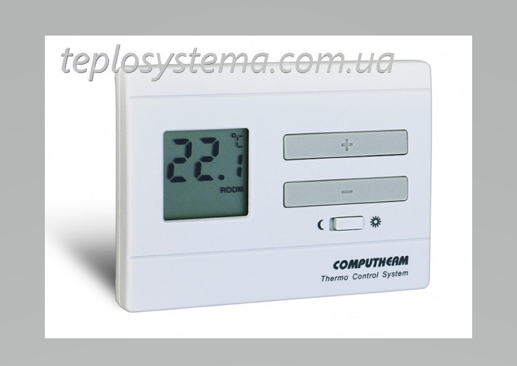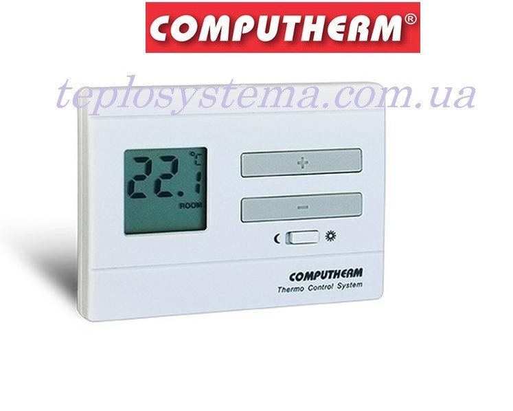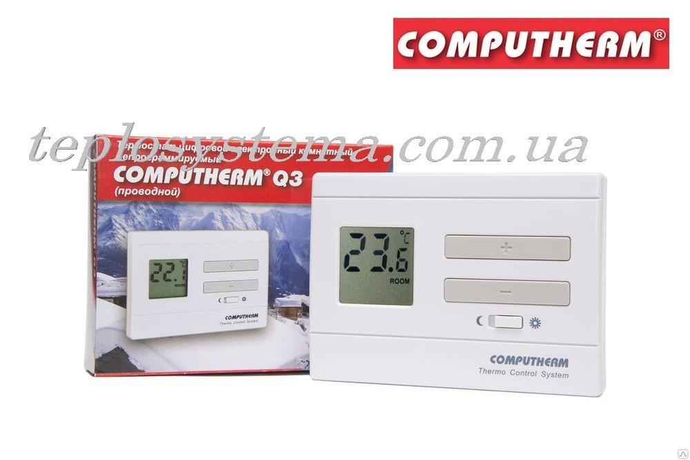 Computherm  Q3 — це дротовий кімнатний цифровий терморегулятор із цифровим дисплеєм, призначений для керування опалювальним обладнанням (котел, нагрівач та ін.) і для підтримки та регулювання комфортної температури повітря в приміщенні. Терморегулятор Computherm Q3 з цифровим дисплеєм забезпечить точніше вимірювання температури повітря в приміщенні. Встановивши на термостаті бажану температуру повітря —  ви отримуєте комфортну температуру в приміщенні та чималу економію енергоносія (газ, електрика).Термостат Computherm  Q3, під'єднаний до котла або нагрівача за допомогою двожильного кабелю, вимикає котел або опалювальний прилад у разі, якщо температура в приміщенні досягне заданого значення і вчасно увімкне опалення, якщо температура в приміщенні опустилася нижче заданого значення. Увімкнення і вимикання відбувається за допомогою кнопок.