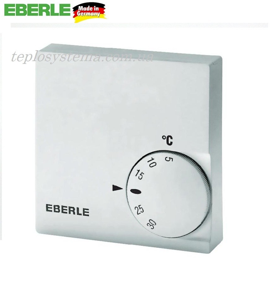 Кімнатний терморегулятор для інфрачервоних нагрівачів, теплових панелей і конвекторів Eberle RTR-E 6121 — недорога модель механічного терморегулятора з вбудованим датчиком температури повітря для систем опалення. Увімкнення і вимикання здійснюється за допомогою регулювального коліщатка.