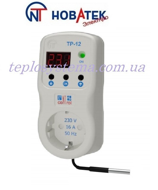 Електронний терморегулятор для керування нагрівачів, ІЧ-панелей, електричних конвекторів, теплових панелей і кондиціонерів — поліпшена модель цифрового терморегулятора для підтримання постійної температури повітря в тому приміщенні, де встановлений терморегулятор. Терморегулятор ТР — 12 має функціями реле напруги, захищаючи під'єднані електроприлади від неможливих рівнів напруги, а також витримкою заданого користувачем часу АПВ перед увімкненням навантаження. Терморегулятор ТР — 12 підтримує задану температуру в приміщенні, включно з електроприлаштуванням, водночас на дисплеї показується значення температури, виміряна датчиком температури повітря. Вилка терморегулятора ТР — 12 просто вмикається в стандартну розетку із заземленням.
