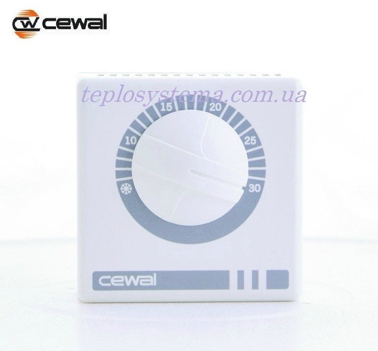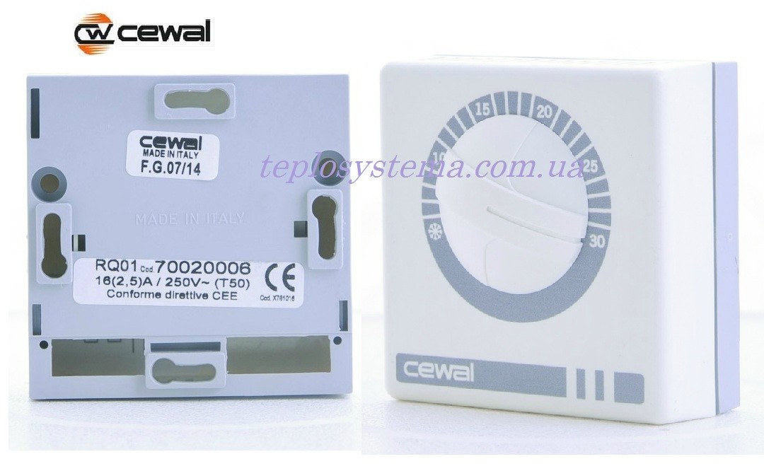 Кімнатний механічний терморегулятор для підтримки та регулювання комфортної температури в приміщенні. Термостат Cewal RQ — 01 призначений для керування більшістю котлів (може просто під'єднуватися до газового котла або до будь-якого кліматичного обладнання: інфрачервоним нагрівачів, тепловим панелям, конвекторам і багато іншого) — недорога модель механічного терморегулятора з вбудованим датчиком температури повітря для систем опалення. Вмикання й вимикання здійснюється за допомогою регулювального коліщатка.