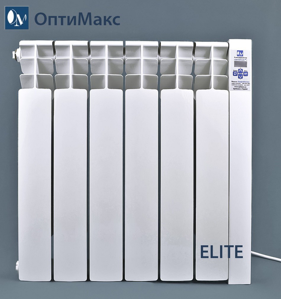 Електричний радіатор (електрородиатор) Оптимакс® ELITE — призначений для повноцінного автономного опалення приміщень будь-якого типу або для допоміжного опалення. Електрорадіатори Оптимакс виробляються двох типів — Elite і Standard. Відмінність між ними полягають у різній комплектації секцій. Радіатор серії Elite має велику площу тепловіддання завдяки масивнішим реберам усередині самої секції. Так, вага однієї секції серії Elite становить 1,7 кг, а Standard — 1,2 кг. Відличити візуально секції нагрівачів серії Elite от Standard дуже просто. Радіатори Elite мають ширину лицьової пластини будь-якої із секцій електрорадіатора 7,5 см, а тильного — 6,2 см. У Standard - відповідно 6,8 і 4 см. Тепловіддача Elite становить 202 Вт, а Standard — 160 Вт, ефективність Elite на 15-20% краща, ніж у Standard. Електрорадіатор простий у встановленні та використанні — компактний і зручний, ви легко можете перемістити нагрівач у зручне для Вас місце обігріваного приміщення — можна легко встановити на стіну або на підставку. Обладнаний програмним терморегулятором.