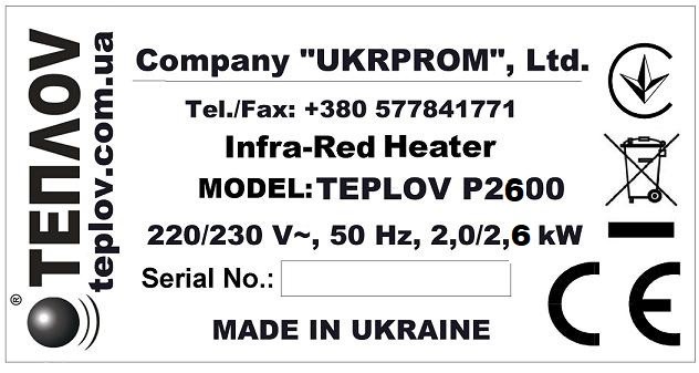 Інфрачервоний нагрівач ТеплоV П2600 (Україна)