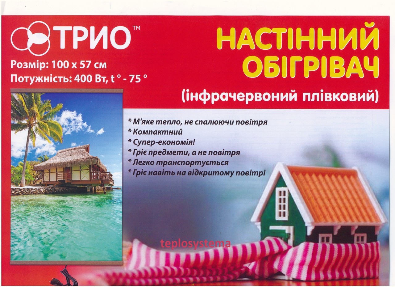 Настінний плівковий обігрівач ТріоTM- обігрівач місцевого (локального) обігріву — широко використовується в період міжсезоння (тобто, коли вже вимкнене центральне опалення або коли ще не включили центральне опалення). Нагріє Ваше робоче, спальне місце або місце відпочинку, обігріє дитину, що сидить за столом під час роботи за комп'ютером, а також створить тепло та затишок у ванній кімнаті! Настінний плівковий обігрівач картина — компактний і зручний, ви легко можете перемістити обігрівач у ту частину кімнати де потрібно створити комфортну температуру. Настінний плівковий обігрівач ТріоTM — можна легко встановити на стіну, водночас не потрібно витрачати багато зусиль для кріплення обігрівача, оскільки в нього невелика вага.