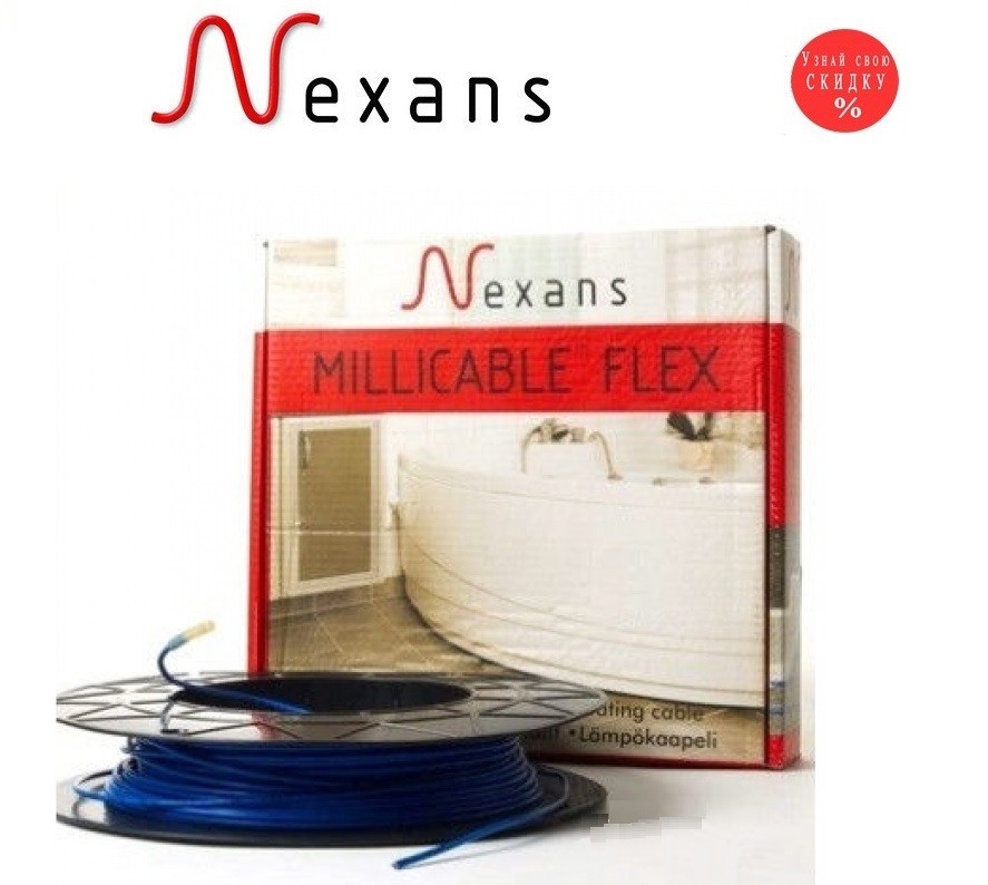 Нагрівальний кабель Nexans Millicable Flex 15 (15Вт/м2) 375 Вт Норвегія — тонкий кабель з екраном із суцільної алюмінієвої трубки (без сітки з клейкою основою) розроблений і виробляються компанією Nexans в Норвегії для системи теплої підлоги, яка монтують безпосередньо під плитку в клей, водночас висота клею буде мінімальна (5-8 мм), тому що тонкий нагрівальний кабель Nexans Millicable Flex 15 (15 Вт/м2) обладнаний системою БЕЗМУФТОВОГО З'ЄДНАННЯ). З'єднання грючого кабелю з поживним дротом зроблене так, що сама муфта проходить під захисним екраном і зверху прокладена суцільна тефлонова ізоляція. Такий спосіб з'єднання усуває проблеми, пов'язані зі з'єднанням дротів у муфті звичайним способом і перериванням суцільної ізоляції під термоусадковою трубкою. З'єднання без муфти в місці з'єднання холодного та нагрівального кабелів робить кабель абсолютно водонепроникним і ідеальним для використання у вологих приміщеннях.